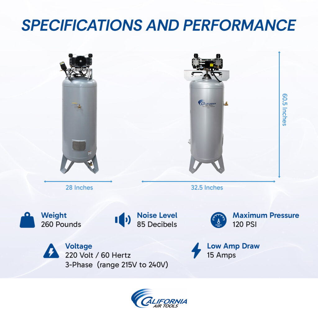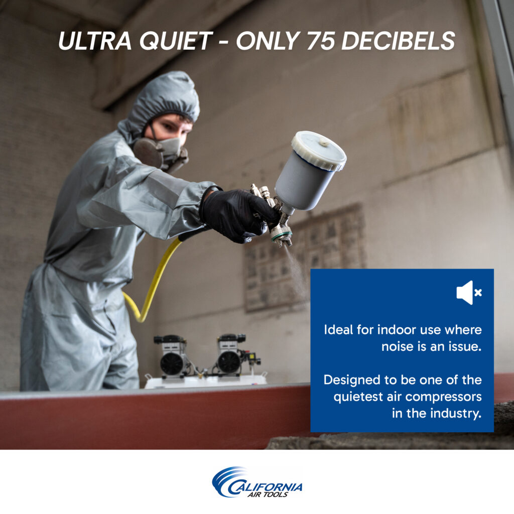 The CALIFORNIA AIR TOOLS 60065C Ultra Quiet & Oil-Free Air Compressor is designed to be one of the quietest 6.5 Hp air compressors in the industry having only 85 decibels of sound compared to competitive models.